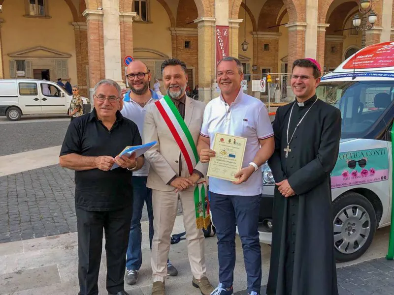 Si è tenuta in piazza della Madonna a Loreto, la cerimonia di consegna del nuovissimo pulmino donato alla Caritas di Loreto nella persona di Don Vincenzo Mattia. L’acquisto è stato possibile grazie al contributo di molte aziende del territorio, tra cui LAL. A ricevere l’attestato di riconoscenza consegnato dal Presidente della Mensa Lauretana della Carità, è stato Renato Moroni, alla presenza anche del Sindaco Nicoletti, dell’assessore allo Sport Mariani e del Vescovo di Loreto, Monsignor Fabio Dal Cin.